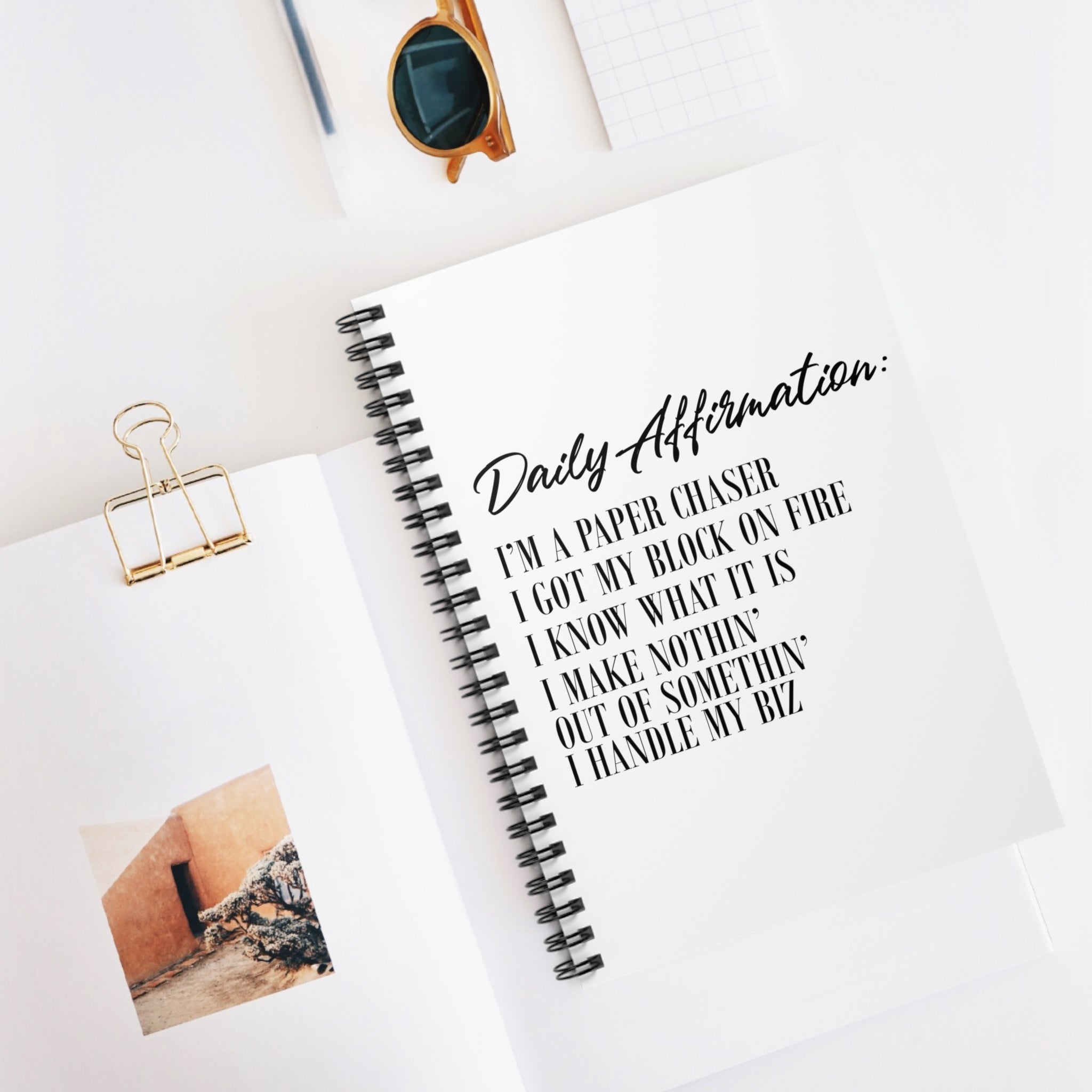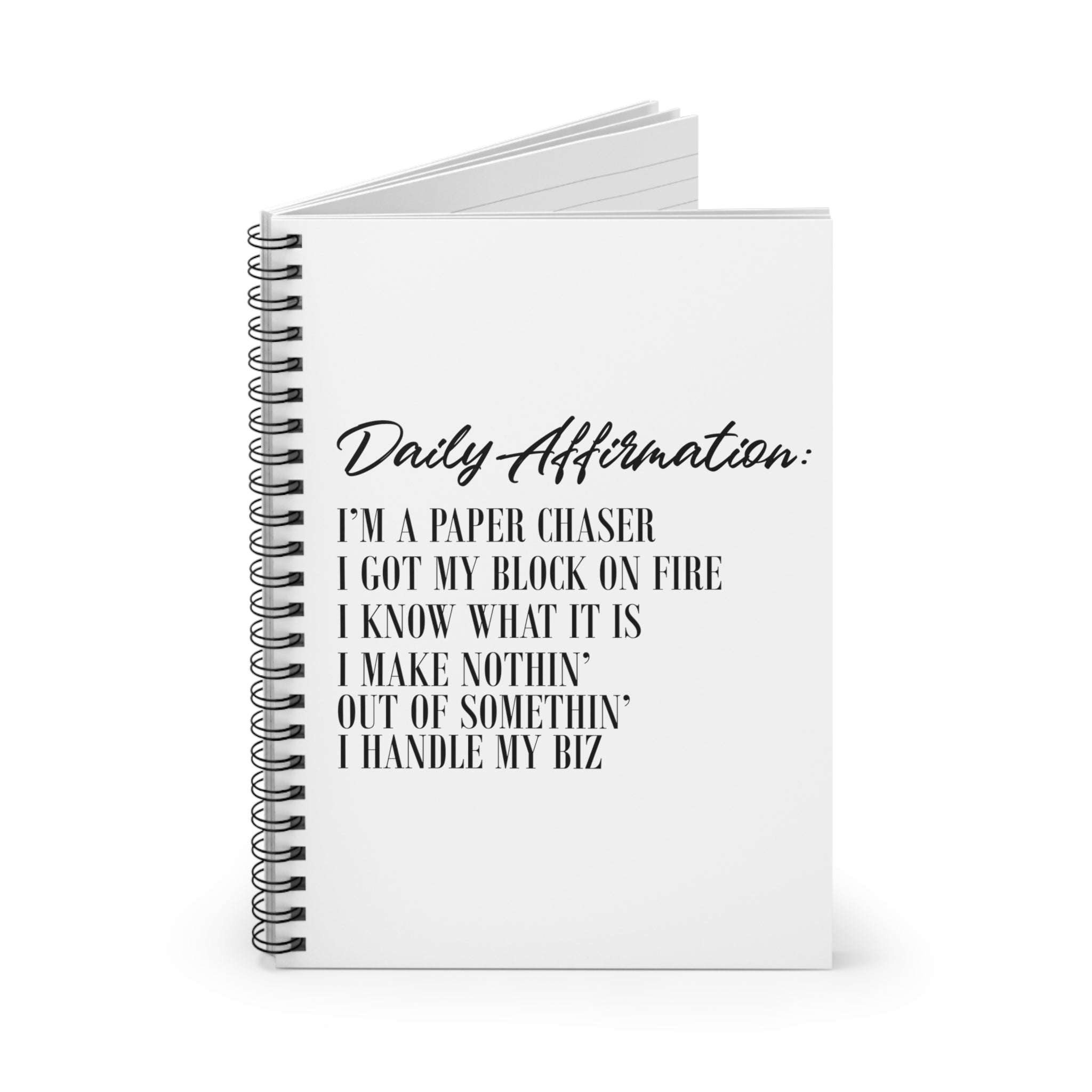 This 118-page spiral notebook with ruled line paper is a perfect companion in everyday life... to-do lists, business notes, inspiration, etc.