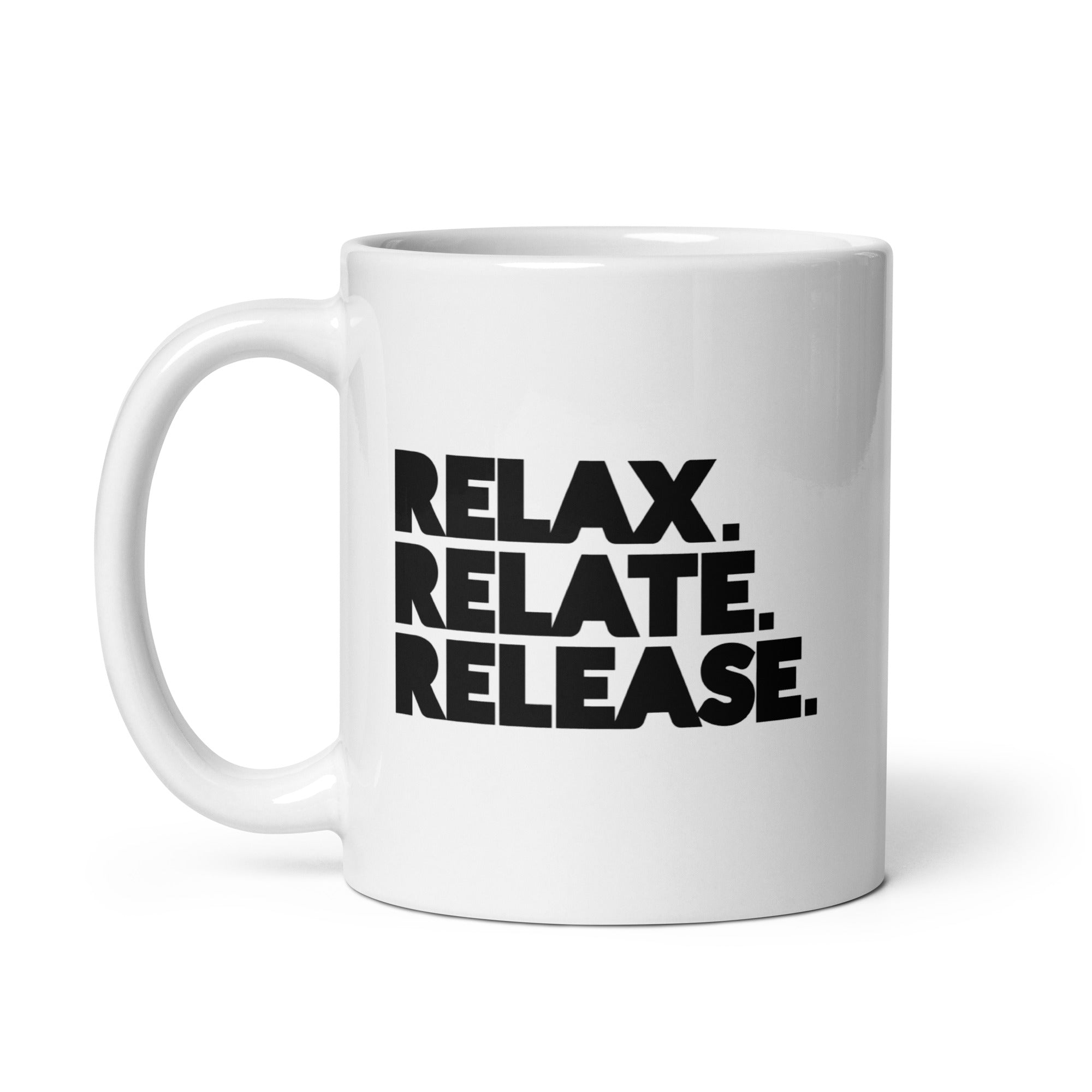 Relax. Relate. Release. White Glossy Mug